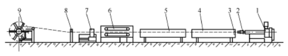 В настоящее время трубы ПВХ и ПО являются самой объемной продукцией как внутри страны, так и за рубежом.Рисунок 1показана технологическая схема производства труб из полиолефина (ПО). В матрицу с кольцевым зазором (2) пластик подается шнеком в виде равномерно пластифицированного расплава, выдавливая заготовку трубы. Он сразу поступает в калибровочный блок (3) для охлаждения и калибровки, а затем подвергается дальнейшему достаточному охлаждению в охлаждающем баке (4). Труба вытягивается с постоянной скоростью с помощью регулируемоготянущая единица(6)и, наконец, отрежьте до заданной длины резаком (7). Тонкостенные трубы диаметром менее 160 мм можно сматывать в рулоны с помощью намоточного устройства (9).