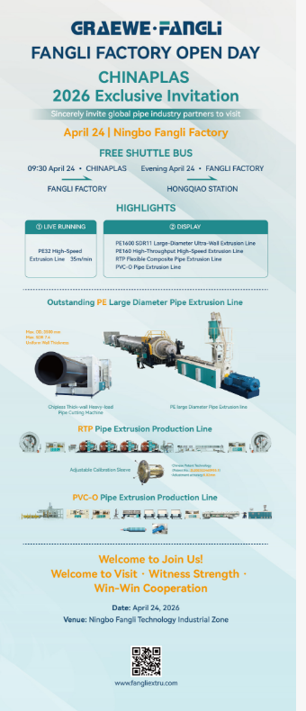 С 21 по 24 апреля на выставке CHINAPLAS 2026 посетите Fangli Technology на стенде 7.1C14. Давайте вместе изучать инновации и будущее сотрудничество в области оборудования для пластиковых труб!